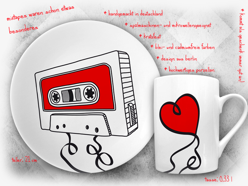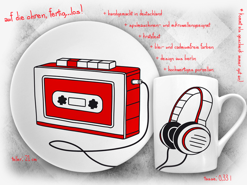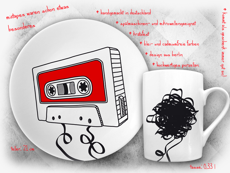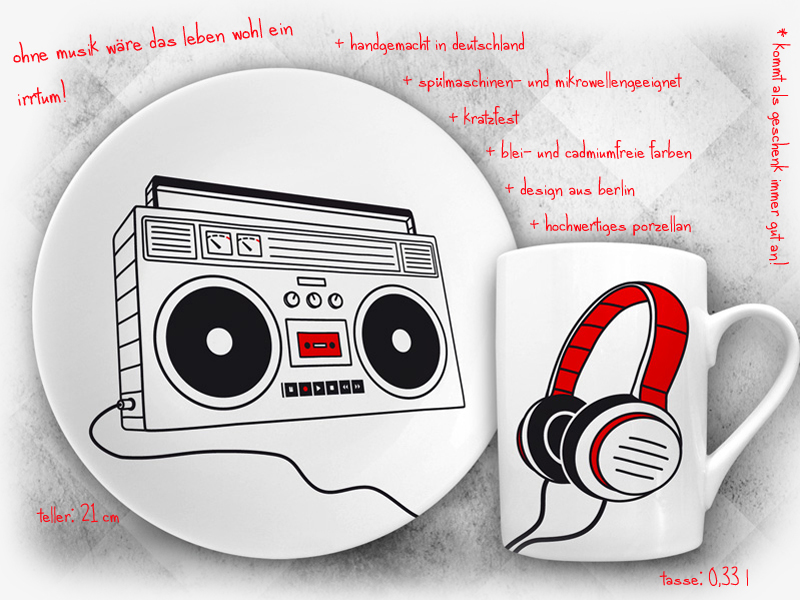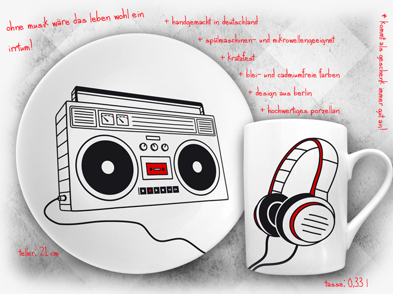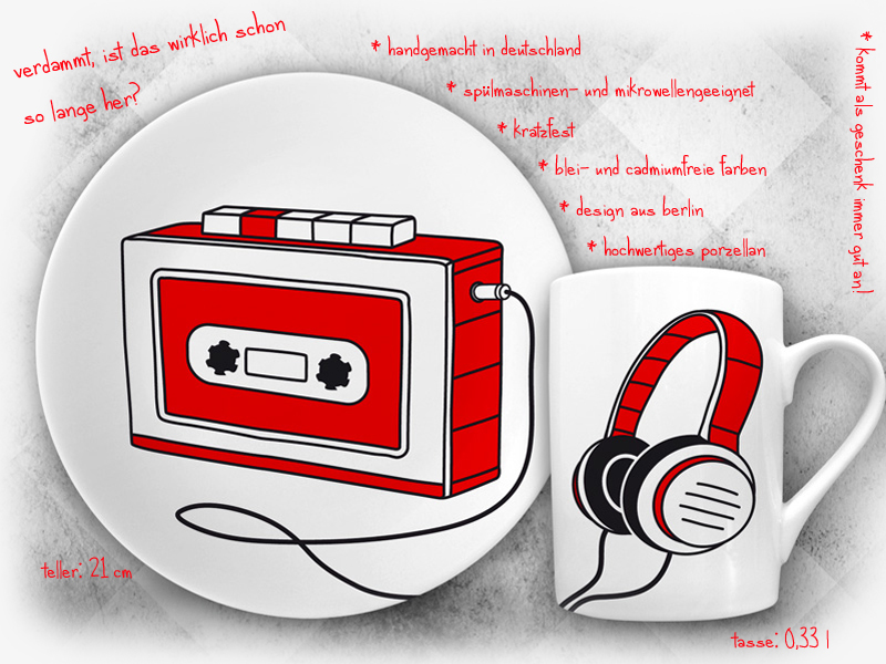 Die tellerundtasse-Sets beinhalten einen Teller und eine Tasse. Das Besondere daran sind die Motive, welche sich besonders als Geschenkidee für Kassetten- und Vinyl-Liebhaber, Musiker, DJs, Retro-Fans oder Fotografen eignen. Tolle Geschenke für Gitarristen, Bassisten, Sänger und Schlagzeuger sind ebenfalls dabei. Weihnachten rückt schließlich auch wieder näher.