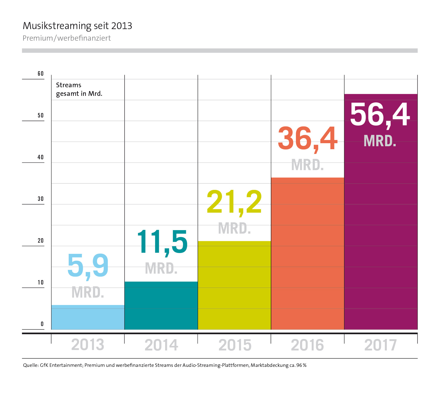Der Bundesverband Musikindustrie (BVMI) meldet in seiner heute veröffentlichten Bilanz einen annähernd stabilen Musikmarkt in Deutschland. Im Jahr 2017 waren laut Verband physische Tonträger deutlich weniger gefragt als im Vorjahr. Streaming wuchs dagegen weiter kräftig.