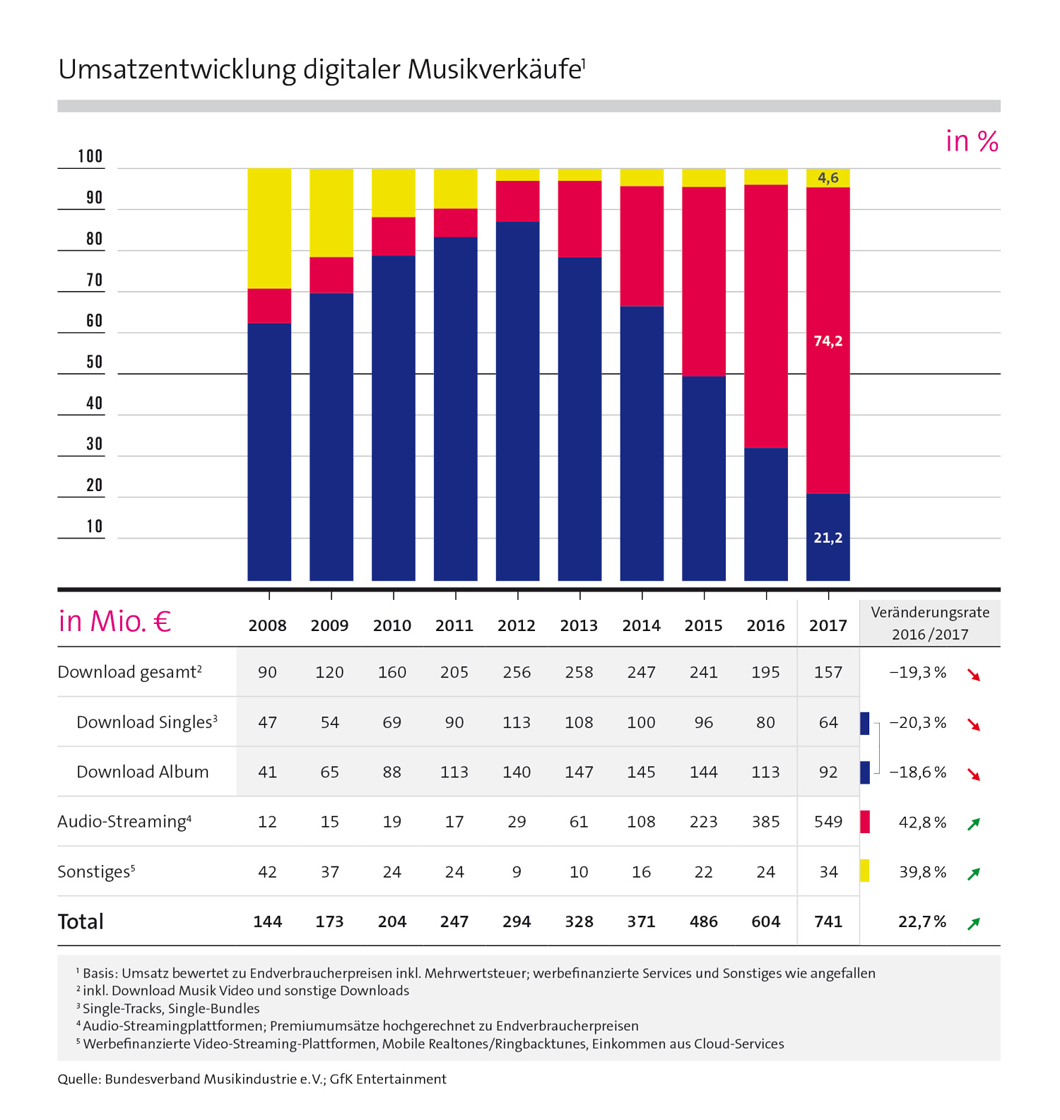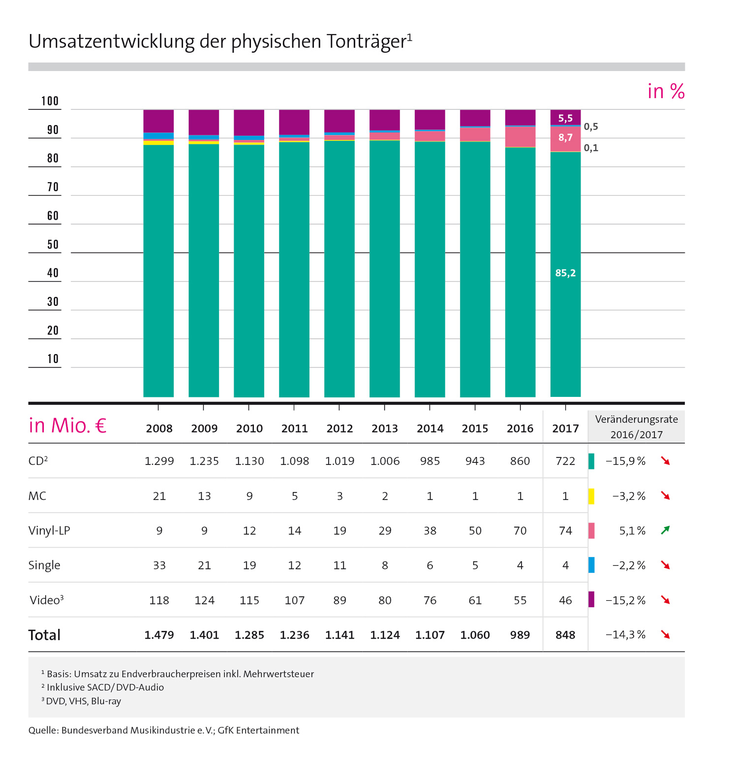 Die CD blieb 2017 mit 45,4 Prozent stärkstes Umsatzsegment, gefolgt von Audio-Streaming (34,6 Prozent) und Downloads (9,9 Prozent). Weiterhin angestiegen ist der Verkauf von Vinyl und nimmt dabei mit 4,6 Prozent Marktanteil die vierte Position ein. Der Anstieg war dabei nicht ganz so stark wie in den Jahren zuvor (+5,1 Prozent im Vergleich zu 2016).